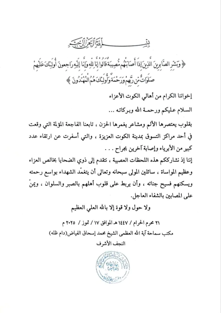 إننا إذ نشارككم هذه اللحظات العصيبة ، نتقدم إلى ذوي الضحايا بخالص العزاء وعظيم المواساة ، سائلين المولى سبحانه وتعالى أن يتغمّد الشهداء بواسع رحمته ويسكنهم فسيح جناته ، وأن يربط على قلوب أهلهم بالصبر والسلوان ، ويمن على المصابين بالشفاء العاجل.
